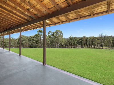 Outdoors a fully fenced backyard, carport between garage and house and tank water.